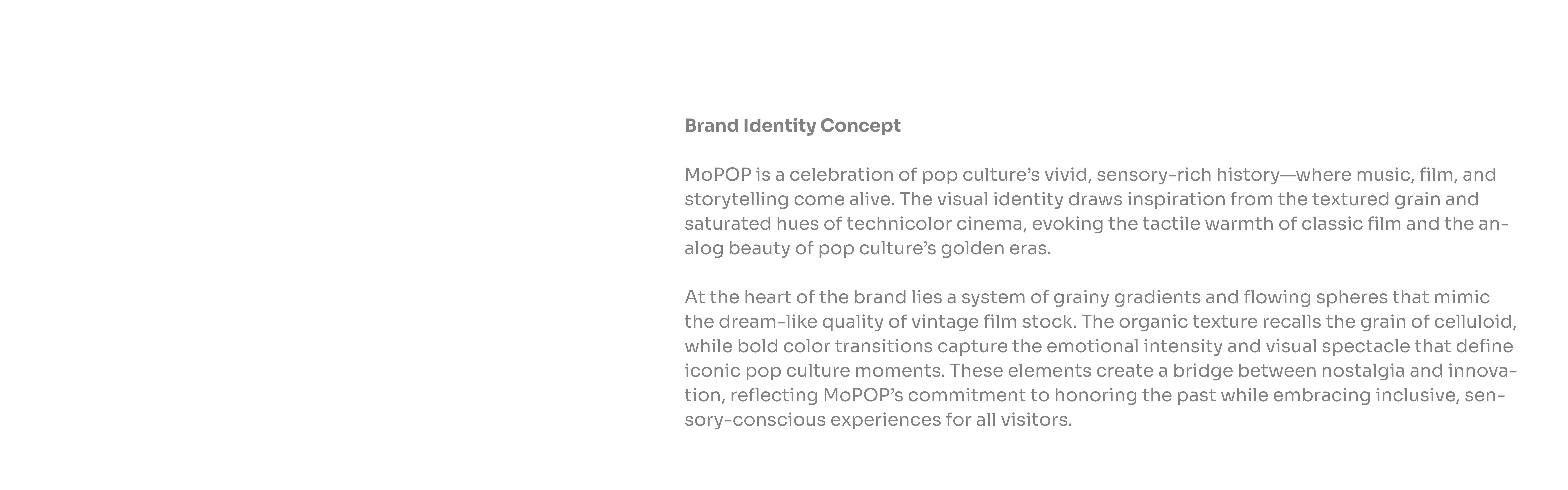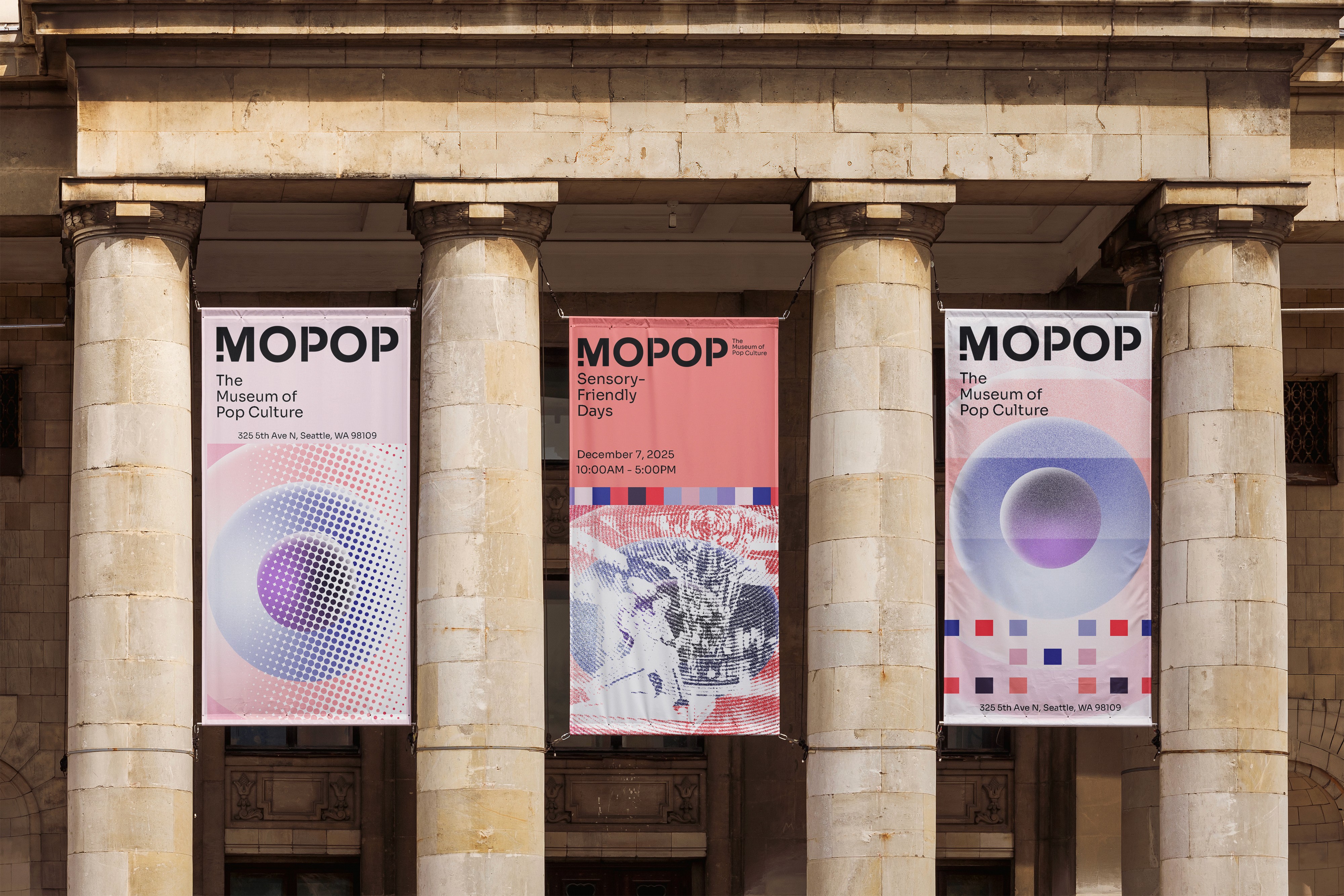 Grainy gradients and soft spheres evoke the tactility of analog film and the rhythm of sensory perception. The result bridges nostalgia and accessibility—transforming MOPOP into a space where everyone can experience the vibrancy of pop culture in a way that feels comfortable, inclusive, and deeply human.