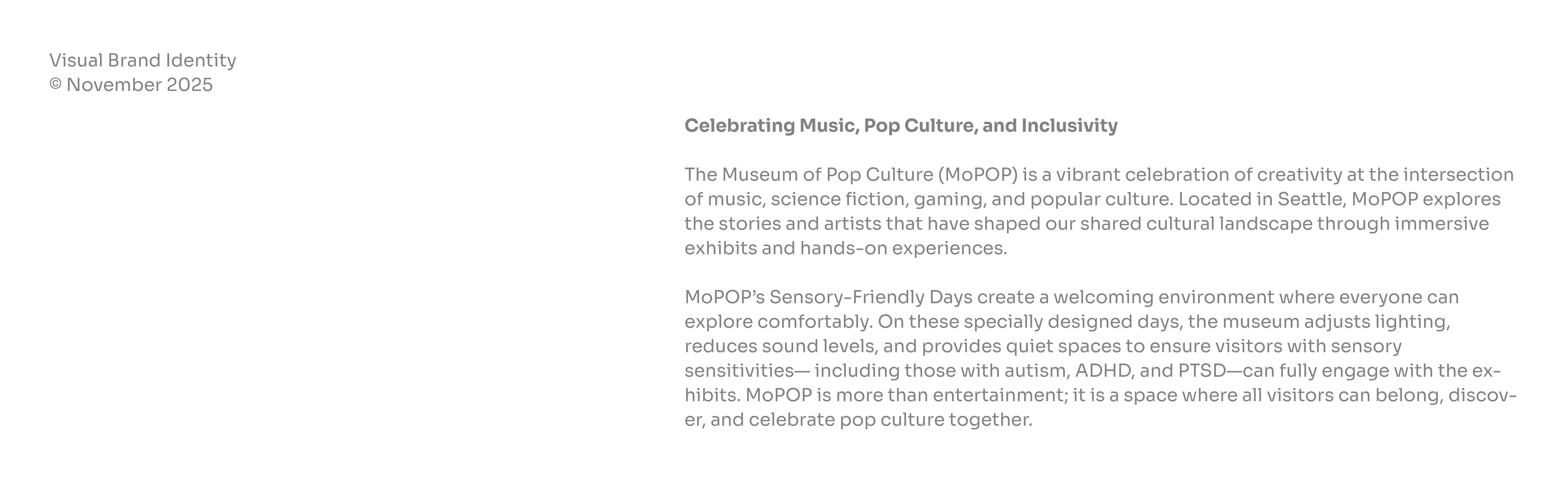 This project reimagines MOPOP through the psychology of color and sensory design. By lowering sound and light while amplifying warmth and texture, the identity explores how pop culture can be both vivid and calming.